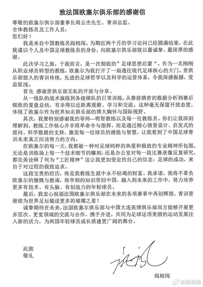 北京时间10月21日,颜向闯在社交媒体上发文,感谢欧塞尔俱乐部对他在这里两个月的留学学习表示感谢。致法国欧塞尔俱乐部的一封感谢信 亲爱的欧塞尔俱乐部主席、青训总监周云杰先生,全体教练员和工作人员: 大家好!我是严向创,来自中国的教练。历时近两个月的考察访问圆满结束。我谨以个人和中国足球教练的身份向欧塞尔俱乐部致以最诚挚和最深的谢意。这次学习之旅,对于我来说,是一次完整的“足球思想讲解”。作为一名刚刚从职业球员转型的教练,欧塞尔为我打开了一扇通往现代足球核心的大门。我对iy青训俱乐部悠久的传统、先进的足球理念、科学的运作体系感到非常惊讶,很多人都从中受益。首先,感谢您俱乐部的不计后果的开放和分享。从战术演练来看从一线队到各级梯队的日常训练,从赛前严谨的数据分析到赛后细致的分析总结,我有幸近距离观察、学习和交流。这种非正式、开放的态度体现了奥克塞尔作为世界知名俱乐部的博大胸怀和国际视野。其次,我要特别感谢我的导师、明志教练以及每一位教练。您很理解我,教练的主要任务不是简单的命令和命令,而是通过精心的场景设计、启发式的问题、科学数据的支撑,激发每个球员的潜力和智慧。你让我看到了中国足球青训未来真正应该努力的方向。在欧塞尔的每一天,我都被对足球的纯粹热爱和极致的职业精神所包围。无论是敲定训练场上的每一个技术细节,还是反复研究每一场比赛办公室里的ideo,他们完美地诠释了什么是“艺术品”。这让我更加坚定了自己的信念:足球的成功来自于最终渴望的过程。这段宝贵的经历将成为我教练生涯中的宝贵财富。我承诺将不辜负欧塞尔的慷慨教诲,把在中国学到的知识带回国内,融入到今后的工作中,努力培养出技术精湛、聪明才智、富有创造力的年轻球员。最后,衷心祝愿法国欧塞尔俱乐部在今后的各项赛事中取得更大的成绩,也祝愿学霸们继续为世界足坛输送出更加璀璨的明星!我们衷心希望未来法国欧塞尔俱乐部与中国大连英博俱乐部能够开展更多层次、更广泛领域的交流合作,共同为足球这项美丽运动的发展注入新的活力,为青少年的成长搭建更广阔的舞台。来自两国的层。向严向创致以问候